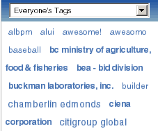 The tag cloud appears on the right side of the Search Results page. The tag cloud is a set of tags wherein each tag's size is determined by the number of objects that it is applied to in the search results. Tags that have been applied to a greater number of objects in the search results are larger than tags that have been applied to fewer objects in the search results.
